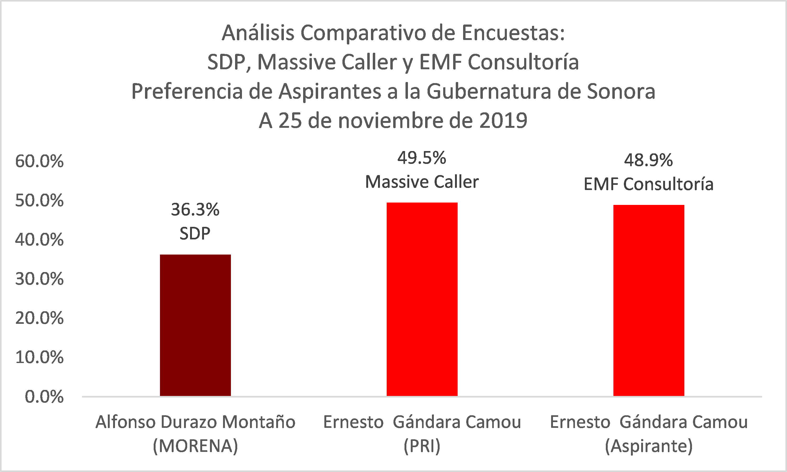 A continuación, se presenta un análisis comparativo metodológico de los estudios de opinión de SDP, Massive Caller y EMF Consultoría, relativos a la preferencia ciudadana de los aspirantes a la gubernatura de Sonora rumbo a 2021: