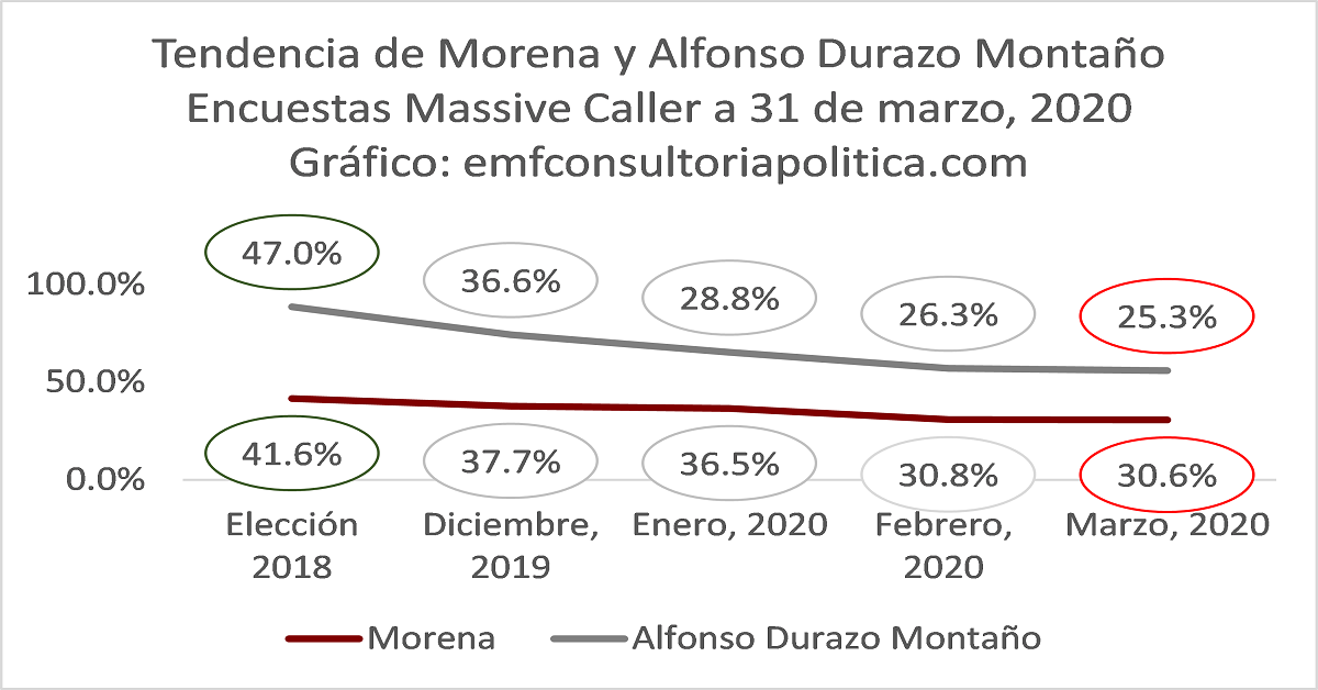 EMF Consultoría Política presenta en base a un análisis comparativo del escenario o careo más probable en prospectiva, la tendencia de posicionamiento y preferencia electoral del partido Morena y su principal aspirante a la gubernatura de Sonora, Alfonso Durazo Montaño, de conformidad con los resultados de los estudios de opinión de la empresa Massive Caller durante el periodo diciembre, 2019 a marzo, 2020.