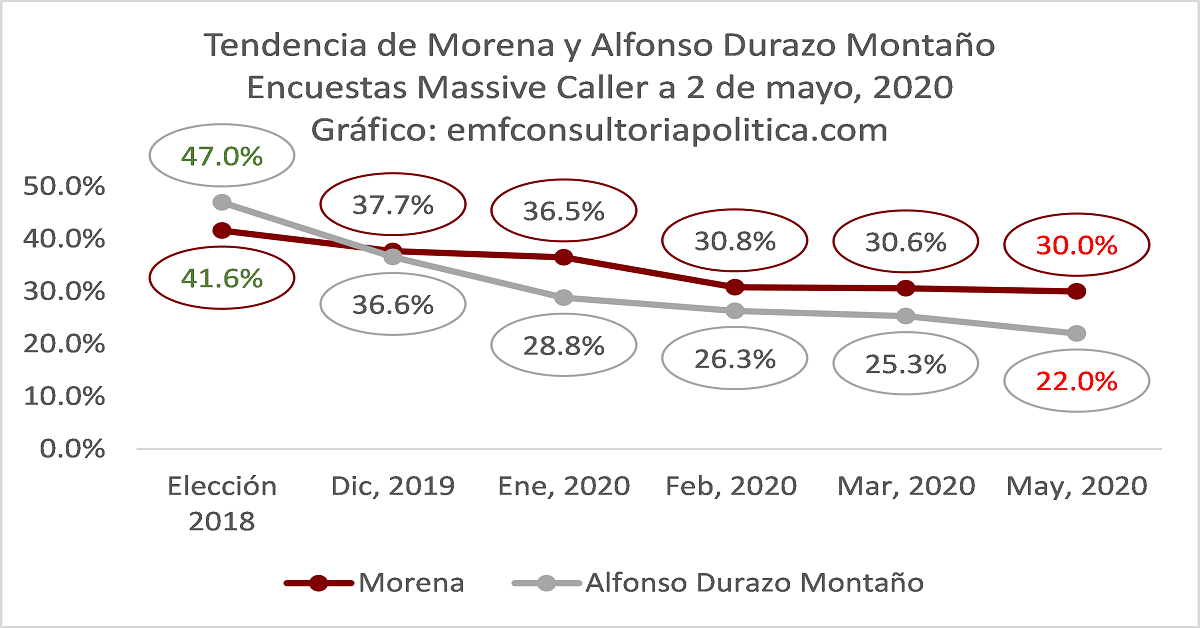 • Alfonso Durazo Montaño decrece 3.3 puntos porcentuales en mayo al ubicarse en 22% y un 25% acumulado desde el resultado de 47% en la elección de 2018.
