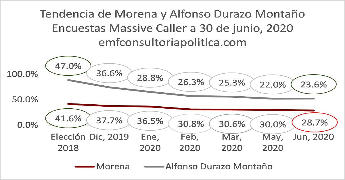 EMF Consultoría presenta una análisis comparativo gráfico de la tendencia de Morena y Alfonso Durazo Montaño rumbo a la gubernatura de Sonora en 2021, con respecto a los estudios de opinión de la Encuestadora Massive Caller.