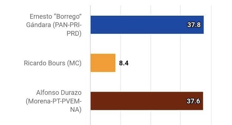Hasta este momento, el candidato de la coalición PAN-PRI-PRD presenta las mismas preferencias electorales que su contendiente, abanderado por la alianza Morena-PT-PVEM-NA.