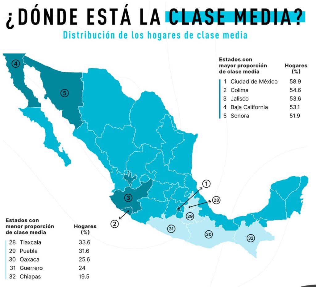 En contraste, el menor porcentaje de concentración de este sector de la población se lo lleva el estado de Chiapas, pues cuenta con tan sólo el 19.5% del total de su población, detrás de Guerrero que suma el 24% de población en condiciones de clase media: