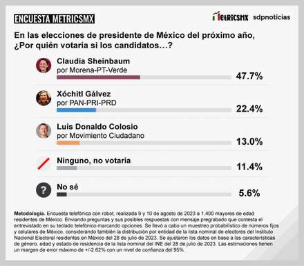 Encuesta telefónica con robot, realizada los días 9 y 10 de agosto de 2023 a 1,400 mayores de edad residentes de México. Se enviaron preguntas y sus posibles respuestas vía mensaje pregrabado que contesta el entrevistado en su teclado telefónico, marcando opciones.