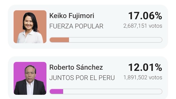 - Keiko Sofía Fujimori Higuchi, Fuerza Popular: 17.056% votos válidos, 2,687,151 votos